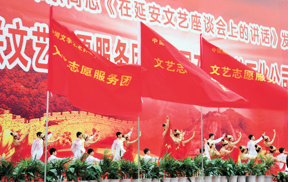 为纪念毛泽东同志《在延安文艺座谈会上的讲话》发表70周年,学习贯彻党的十七届六中全会精神和胡锦涛总书记在第九次全国文代会上的重要讲话精神,落实中宣部关于深入开展“走基层、转作风、改文风”活动要求,由中国文联主办,中国杂协、中国文联国内联络部、吉林省文联、吉林市委市政府、中国石油吉林石化公司承办的纪念毛泽东同志《在延安文艺座谈会上的讲话》发表70周年中国文联文艺志愿服务团赴中国石油吉林石化公司采风慰问演出活动,于5月26日在吉林省吉林市举行。中国文联党组书记、副主席赵实,中国文联党组副书记、副主席李屹率领由杂技、戏剧、音乐、舞蹈、曲艺、美术、书法、电影、电视、民间文艺等艺术门类的100多名演职人员组成的志愿服务团,来到中国石油吉林石化公司,为工作在生产第一线的吉林石化公司的工人们以及吉林市社会各界奉献了一台丰富多彩的高水准文艺演出。