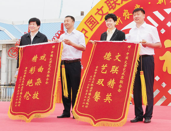赵实、李屹代表中国文联接受大荒地村赠送的锦旗