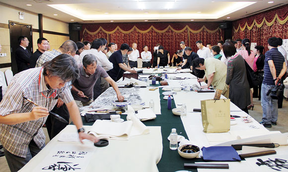 书画家们现场创作作品赠送基层群众