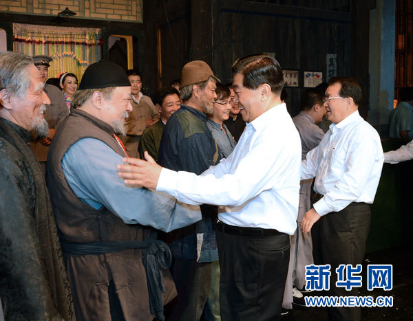 6月8日,在北京人民艺术剧院建院60周年之际,中共中央政治局常委、全国政协主席贾庆林,中共中央政治局常委李长春来到首都剧场,与首都观众一起观看北京人艺经典话剧《茶馆》。这是演出结束后,贾庆林、李长春等走上舞台,与演职人员一一握手,亲切交谈,祝贺演出成功。 新华社记者 刘建生 摄
