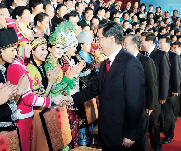 6月12日,第四届全国少数民族文艺会演在北京国家体育馆隆重开幕。胡锦涛、温家宝、贾庆林、李长春等出席开幕式文艺晚会。演出开始前,胡锦涛等会见了参加会演的各少数民族演职人员代表。新华社发