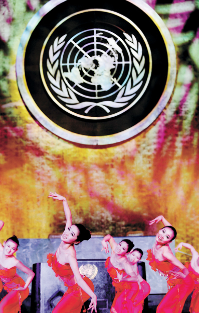 6月25日,在纽约联合国总部联大会议厅,浙江省残疾人艺术团聋人舞蹈演员表演舞蹈《红蜻蜓》。当日,为庆祝2012年联合国公共服务日,以中国传统和现代音乐舞蹈为主题的“和谐之声”文艺演出在纽约联合国总部的联大会议厅举行。新华社记者 申宏 摄