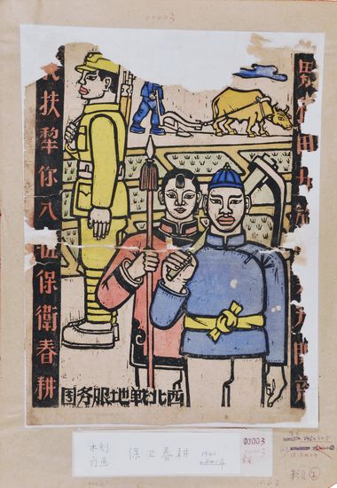 木刻《保卫春耕》 晋察冀边区的美术家徐灵创作于1940年。他以抗战需要为己任,其作品内容丰富,形式多样,时代特色明显。