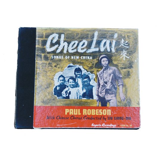 《义勇军进行曲》(CHEE LAI)唱片 1941年美国纽约出版,黑人歌唱家保罗·罗伯逊演唱。1940年罗伯逊在纽约露天音乐厅用汉语演唱此曲,引起轰动。1941年,罗伯逊与刘良模以及“华侨青年歌唱队”合作,在纽约灌制了英文版中国抗战歌曲专集,向全世界发行。