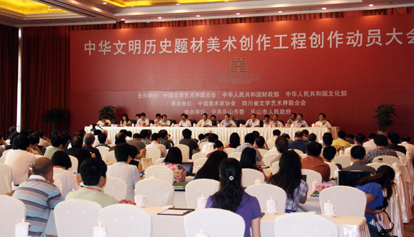 自去年12月中华文明历史题材美术创作工程在京启动、今年5月对外公布选题后,7月24日,由中国文联、财政部、文化部联合主办的工程创作动员大会在四川峨眉山召开。中宣部副部长翟卫华,中国文联党组成员、副主席左中一,中国作协党组成员、书记处书记白庚胜,四川省委常委、宣传部部长吴靖平,中国文联副主席冯远,中国美协分党组书记、驻会副主席吴长江,文化部艺术司副司长诸迪等与本次动员大会的承办方中国美协、四川省文联,协办方中共乐山市委、乐山市政府的相关负责人,以及美术创作工程部分组委会委员、创作指导委员会委员、美术家代表,各省、自治区、直辖市文联、文化厅、美协代表出席动员大会。