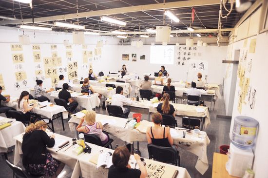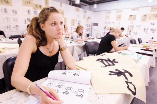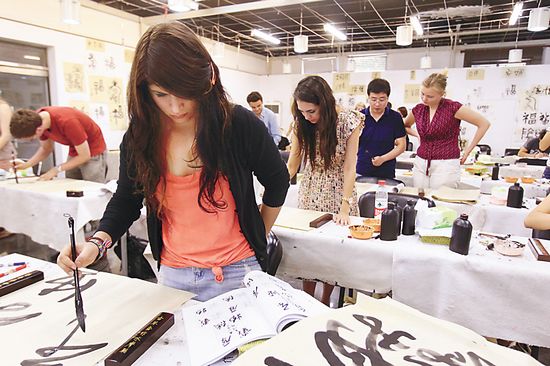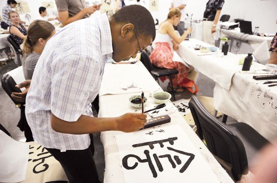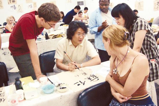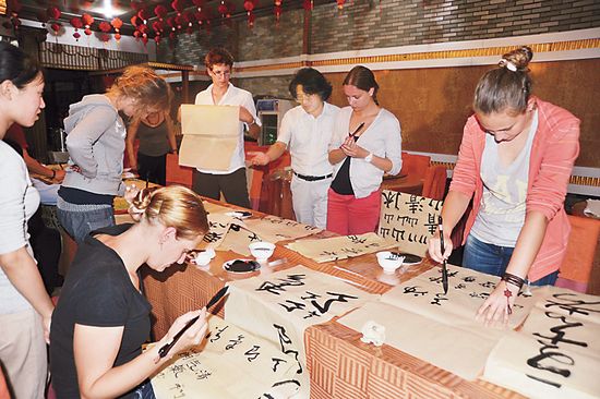 书法是中国最具民族特色的艺术形式之一。全球化时代,世界需要多样化的文化,这一观念已成为全球共识。随着中国改革开放,国际交流日益频繁。历史悠久的中国书法艺术,越来越吸引世界各国爱好东方文化的朋友的关注。来华考察、学习中国文化、中国艺术的人士,也越来越多。如何跨越语言、文化、文字可能带来的障碍,向来自世界各国不同文化背景的学生介绍中国书法,这是时代给我们书法艺术工作者提出的新课题。近年来,中国人民大学艺术学院在这一领域做了一些尝试和探索。