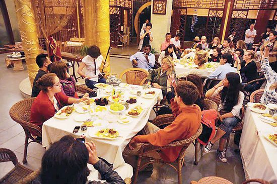 平凉市文联、平凉崇古斋,为这次活动在住宿交通饮食各方面,做了精心安排,他们邀请了本地能讲英文的学生全程陪同。图为当地学生在晚餐后表演才艺。中外学生联欢气氛融洽。