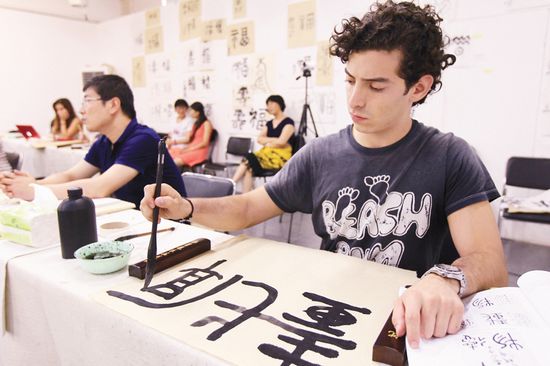 经过短短三周32课时的教学,本期选修的23名国际学生,从第一堂课学习执笔开始,到最后一次课“毕业创作”时,已都能悬肘挥洒自如。这位来自中美洲哥斯达黎加的学生路德斯喜欢草书,悟性相当不错,学了几次,就有点专业书家的范儿。