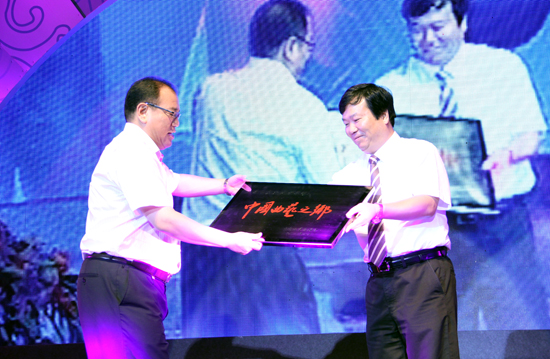 8月31日,为喜迎党的十八大胜利召开,中国曲协组织知名艺术家来到上海市首个曲艺之乡安亭,为当地观众送上了一道涵盖多种艺术形式的文化大餐。图为中国曲协分党组书记、驻会副主席董耀鹏代表中国曲协授予上海市嘉定区安亭镇中国曲艺之乡牌匾。中国文艺网 董大汗 摄
