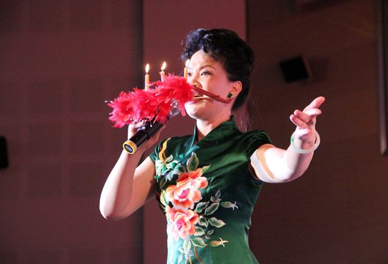 演出中既让观众感到新奇又钦佩不已的当属含灯大鼓表演艺术家温淑萍的表演了。她在嘴里含着一根筷子,筷子上摆放着三支正在燃烧的蜡烛的情况下,依旧将《青藏高原》这首高难度歌曲演绎得非常到位。当天舞台上的风有点大,所以蜡烛烧得很快,尽管火焰的温度烤得脸非常难受,可是为了打消观众心中这可能不是真唱的疑虑,温淑萍还是坚持清唱了一段,现场观众为艺术家此般敬业精神报以热烈的掌声和欢呼声。“我每年都会到基层为观众演出10多次,虽然表演这个节目有时会冒着头发或眉毛被烧到的风险,但是每当看到自己的演出能给观众带来欢笑和愉悦,我觉得这点小风险算不上什么。”温淑萍一边揭着手上已经发干的蜡油,一边跟记者聊着自己参加基层演出的心得。