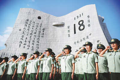 “九一八”历史博物馆近日迎来众多参观者,人们在这里缅怀先烈、铭记历史。武警辽宁边防总队组织新入警的100名大学生警官在这里进行了一场以“勿忘历史 奋发图强”为主题的爱国主义教育活动。图为大学生警官中的党员在“残历碑”前重温入党誓词。 人民日报记者 辛阳摄
