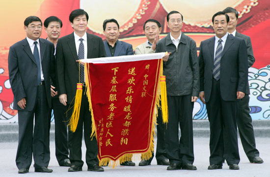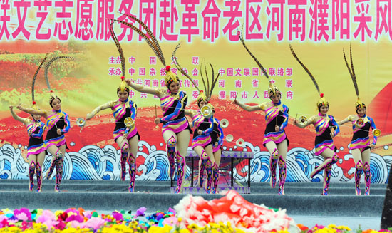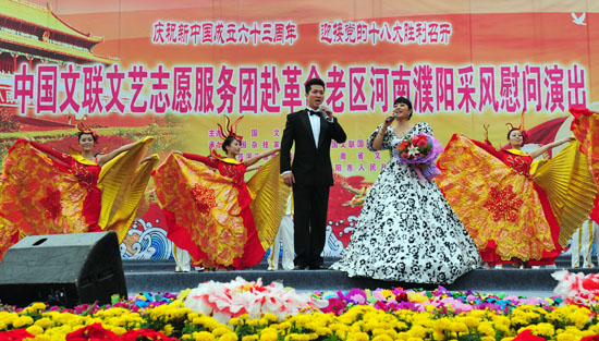 为庆祝新中国成立63周年、喜迎党的十八大胜利召开,中国文联主办,中国杂协、中国文联国内联络部、河南省委宣传部、河南省文联、濮阳市委市政府承办了此次中国文联文艺志愿服务团赴革命老区河南濮阳采风慰问演出活动。中国文联党组副书记、副主席李屹在活动上的致辞中表示,在河南濮阳举办这次采风慰问演出活动,就是要把党和政府的亲切关怀、把广大文艺工作者的深情厚谊送给革命老区的父老乡亲们,让大家共享文化发展的成果、共庆共和国的生日、共迎十八大的胜利召开。为贯彻落实党的十七届六中全会精神,中国文联成立了中国文联文艺志愿服务团。此次活动就是文艺工作者到人民中、到生活中、到实践中去,志愿为人民群众服务的具体行动,就是文艺工作者积极践行“爱国、为民、崇德、尚艺”的文艺界核心价值观的一次教育实践活动。