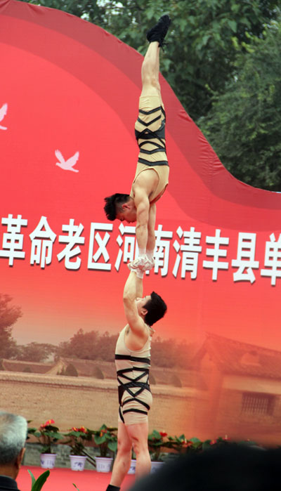 小分队赴清丰县单拐村演出。图为遂宁市杂技团的演员为村民演出杂技