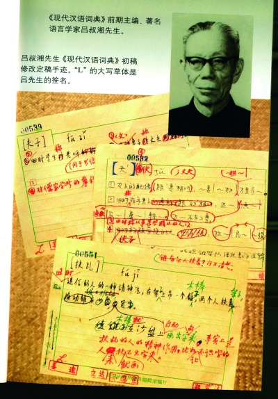韩敬体记下的,是他听来的事情。“那时词典室办公地点在西单一带,而吕先生家住中关村。每天上班,早出晚归,都是乘公共汽车。中午带馒头,就开水吃,可他那时患着胃病。他每周要审改定稿2000条,平均下来,每天要定稿300多条,工作量极大,所以,晚上常常要带稿子回家看。1958年冬天,语言研究所搬到西城端王府,吕先生家也搬到了拣果厂,家离所近了,他就每天晚上和星期天到所里加班,真是极端辛苦劳碌。”在四五年的时间里,吕叔湘出色地主持编纂出《现汉》试印本,为日后的编纂打下了坚实的基础。