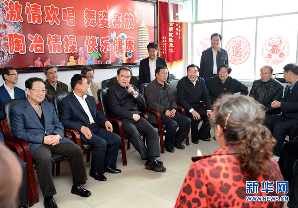 10月8日至10日,中共中央政治局常委李长春在河北张家口调研。这是10月9日,李长春在蔚县南张庄村文化活动中心,向村民了解基层文化活动情况。 新华社记者马占成摄