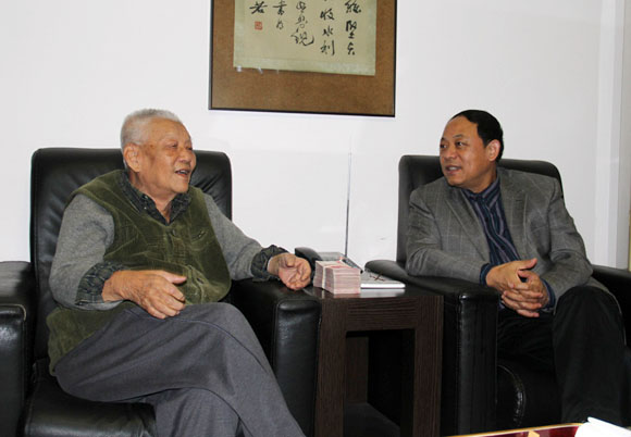 10月16日,中国文联党组成员、书记处书记夏潮看望中国金鸡百花电影节终身成就奖获得主严寄洲。中国文艺网 李博 摄