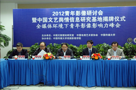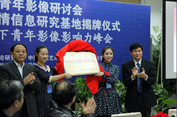 10月25日,由中国文联理论研究室、中国视协、中国传媒大学联合主办的“2012青年影像研讨会暨中国文艺舆情信息研究基地揭牌仪式”在京举行,中国文联党组成员、书记处书记夏潮,中国传媒大学党委书记陈文申,以及仲呈祥、陈建文、张显、廖祥忠等中国文联、中国视协、中国传媒大学相关领导出席活动。夏潮、陈文申共同为“中国文艺舆情信息研究基地”揭牌。夏潮在揭牌仪式上讲话。他说,综观当前文艺创作现状,青年文艺工作者正逐步成为文艺事业繁荣发展的中坚力量。特别是包括电视、电影、摄影在内的影像创作,青年文艺工作者已经成为创作的主体。随着现代高新科技特别是数字技术、信息技术、网络技术的迅猛发展和广泛应用,青年文艺工作者拥有更为活跃的创作思维,更为开阔的创作眼界和更为前卫的创作理念,在接受、运用高新技术参与影像创作方面有着先天优势。而对于影像作品的受众来说,也是以青年人为主要群体。可以说,青年影像的价值取向和影响力对于引领社会风尚、弘扬社会主义核心价值体系都有着至关重要的作用。希望通过举办这次研讨会,青年文艺工作者相互交流,加强合作,不断扩大青年影像的传播力、影响力,为引导创作出更多更优秀的影像作品起到更好的推动作用。