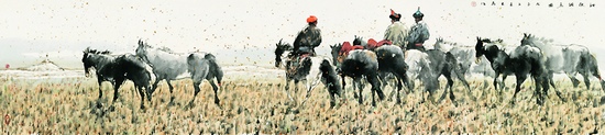 蒙古族、鄂温克族、鄂伦春族和布里亚特、科尔沁、额尔古纳……当这些民族词汇转化为一组组鲜活的形象与场景时,我们仿佛一下子走进了草原:从上世纪30年代,沈逸千、赵望云等美术家进入内蒙古草原进行写生,到2012年百余位美术家走进草原腹地采风创作;从尹瘦石创作于上世纪50年代的《套马图》,到刘大为不久前刚刚创作完成的巨幅作品《欢腾的草原》……当这些作品汇聚于10月27日的中国美术馆之时,新中国成立以来首个规模最大的、以反映内蒙古美术创作为主题的展览,“浩瀚草原——中国美术作品展”拉开了帷幕。