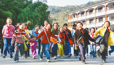 切实保障所有孩子都有学上。图为贵州雷山县苗家孩子高兴地上学。