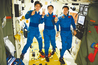 2012年6月18日,神州九号飞船与在轨运行的天宫一号目标飞行器首次载人交会对接取得成功后,航天员景海鹏、刘旺、刘洋在天宫一号实验舱内。