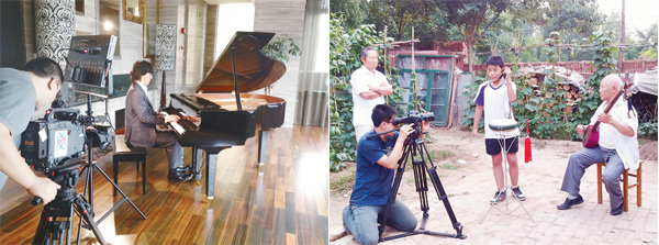摄制组在拍摄著名钢琴家李云迪(左)、沧州木板大鼓(右)