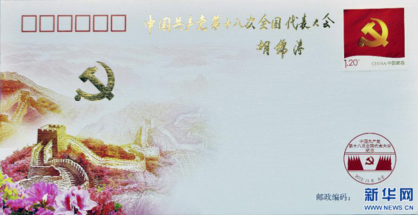 新华网北京11月10日电(记者 韩洁 常志鹏)为庆祝中国共产党第十八次全国代表大会胜利召开,中国邮政于11月8日发行了《中国共产党第十八次全国代表大会》纪念封1枚,纪念邮票一套2枚,小型张1枚。十八大召开前夕,胡锦涛总书记专门为纪念封题词:中国共产党第十八次全国代表大会。