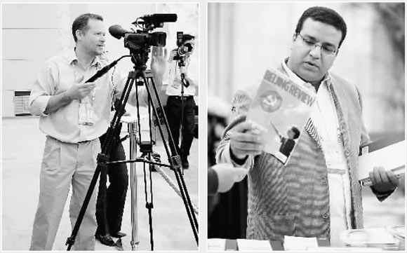 左图:外国记者采访十八大。人民日报记者孟祥麟摄 右图:一名外国记者正在十八大新闻中心报纸杂志区选择感兴趣的书刊。人民视觉