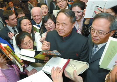 莫言(中)在中国驻瑞典大使馆举行的欢迎酒会上为来宾签名。 新华社发