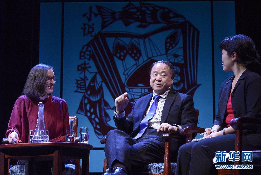 12月12日,在瑞典首都斯德哥尔摩的皇家戏剧院,2012诺贝尔文学奖得主、中国作家莫言(中)参加文学讲谈会,谈论文学创作体验。莫言将于12月13日结束诺贝尔周的全部活动离开斯德哥尔摩回国。 新华社记者武巍摄