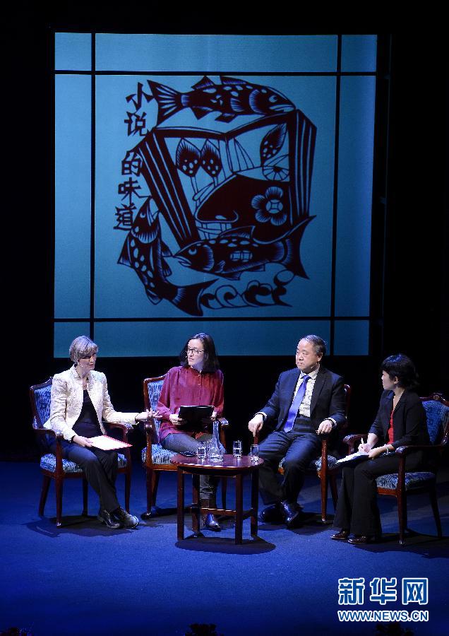 12月12日,在瑞典首都斯德哥尔摩的皇家戏剧院,2012诺贝尔文学奖得主、中国作家莫言(右二)与莫言作品的瑞典文翻译者陈安娜(左一)等参加文学讲谈会,谈论文学创作体验。莫言将于12月13日结束诺贝尔周的全部活动离开斯德哥尔摩回国。 新华社记者武巍摄