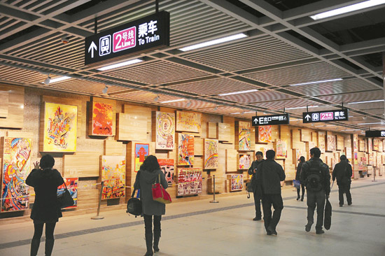 近日,中国首条穿越长江的地铁——武汉地铁二号线一期工程正式通过专家评审,将于12月28日通车试运营。工程全长27.73公里,在武昌和汉口两镇共设车站21座,是武汉市第一条地下轨道交通工程。图为武汉地铁洪山广场站,通道中用武汉各小学的学生画作进行装饰(12月14日摄)。