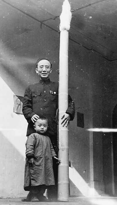 1941年,郭沫若手扶友人赠送的如椽巨笔,偕幼子汉英在重庆留影。