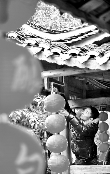 新年将近,湖北省恩施土家族苗族自治州宣恩县在吊脚楼上挂起红红的灯笼,装扮新农村,喜庆迎新年。图为湖北宣恩县黄坪村农民用红灯笼装扮吊脚楼。宋文摄/光明图片