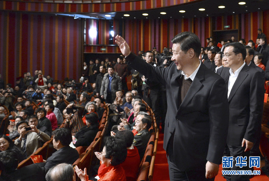 12月30日晚,2013年新年京剧晚会在北京国家大剧院举行。党和国家领导人习近平、李克强、张德江、俞正声、刘云山、王岐山、张高丽,与首都近千名群众一起观看演出,喜迎新年的到来。这是习近平向演员和观众招手致意。新华社记者 马占成 摄