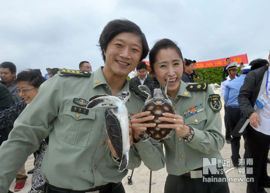 当日,三沙市人民政府在永兴岛举行海龟增殖放流活动。永兴岛驻岛军民和中国文联前来慰问的文艺小分队一起,将240余只海龟放归大海。西沙群岛是中国海域为数不多的有海龟上岸产卵的地点,举行增殖放流对保护我国南海海龟具有重要意义。此次放流的海龟大部分由永兴岛人工繁育。新华社记者 赵颖全 摄