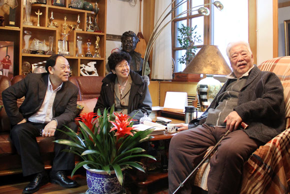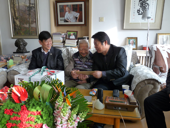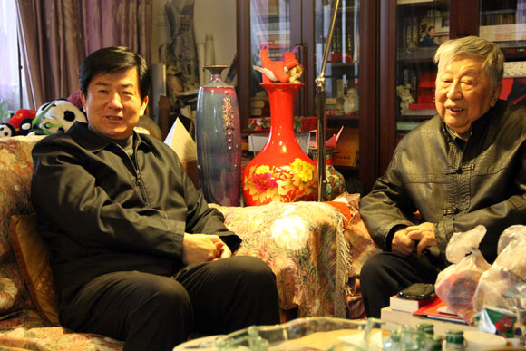 1月14日,中国文联党组书记、副主席赵实,中国文联党组成员、书记处书记夏潮等看望中国文联荣誉委员、著名表演艺术家于洋。中国文艺网 李博 摄