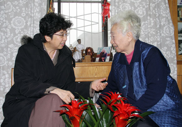 1月14日,中国文联党组书记、副主席赵实,中国文联党组成员、书记处书记夏潮等看望中国文联荣誉委员、著名表演艺术家于蓝。中国文艺网 李博 摄