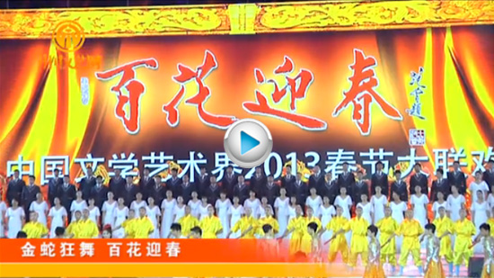 金蛇狂舞,百花迎春。1月13日下午,北京人民大会堂宴会厅群星闪耀、欢声阵阵,由中国文联主办的“百花迎春——中国文学艺术界2013春节大联欢”在这里成功录制,将于春节期间在央视播出。中共中央政治局委员、国务委员孟建柱,全国政协副主席、中国文联主席孙家正出席观看演出。中国文联党组领导赵实、覃志刚、李屹、杨承志、左中一、夏潮、李前光,以及有关部委领导,中国文联在京副主席、荣委、老领导、文艺界代表等也观看演出。