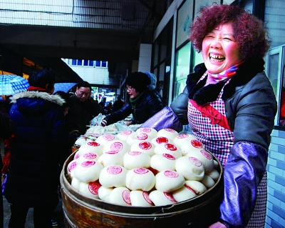 2月7日,在浙江省建德市新安江农贸市场里,店主朱汝珍赶制了两万多个印着红色“喜”字的馒头、荷叶包等传统的乡土过年食品。宁文武摄/光明图片