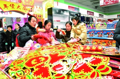 2月6日,山东省淄博市博山区市民在超市购买“年味商品”。李志中、魏其宁摄/光明图片