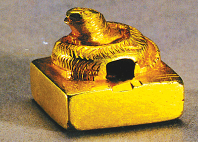 蛇,在中国古代也被视为丰收或子孙繁衍的象征物,特别是在西南或南方地区的古代文化中,常见以蛇为母题的文物。年代最早的是相当于商代晚期古蜀人遗址出土的圆雕石蛇,在四川省成都金沙遗址至少发现过4件,石蛇头三角形,圆目张口,口唇涂成朱红色,身躯呈“S”形蟠曲,被认为是用于祭祀或与原始宗教有关的道具。南方地区的青铜器,也常饰有蛇纹,例如广西恭城出土的春秋时期的青铜尊上就有生动的双蛇斗蛙连续图案。稍迟一些生活在西南的古代民族更常以蛇为丰收或大地的象征物,例如云南省晋宁石寨山、江川李家山等地发掘的古代滇人的墓葬中,经常出土以蛇造型的文物。有以蛇头作銎的青铜铲,也有以蛇体作柄的青铜剑,柄首是张口的蛇头,形态极为生动。至于大量出土的以鸟兽人物为题材的青铜扣饰上,更是多饰有纠缠蟠曲的长蛇。一些表现祭祀、祈年等场景的青铜储贝器盖上的立体群雕中,也少不了蛇的身影。特别是在一座滇王的坟墓中,出土了西汉中央颁赐的黄金印,印文为“滇王之印”,印上的印纽也铸成一条蟠曲的金蛇,成为滇王高贵身份和权威的象征。
