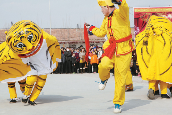 2月19日,演员在山东省东营市东营区龙居镇朱家村表演省级非物质文化遗产“盐坨打虎”,喜迎元宵佳节的到来。在我国传统民俗中,舞龙、舞狮较为常见,“舞虎”却非常独特,具有重要的民俗文化价值。