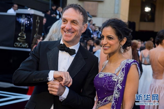2月24日,在美国好莱坞举行的第85届奥斯卡奖颁奖典礼开始前,最佳原创音乐奖提名获得者麦切尔·丹纳(左)携妻子阿帕尔娜亮相红地毯。当天,第85届在好莱坞举行。