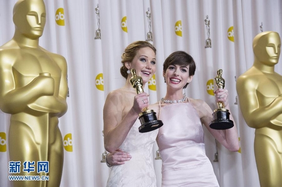2月24日,在美国好莱坞杜比剧院,获最佳女主角奖的詹妮弗·劳伦斯(左)和获最佳女配角奖的安妮·海瑟薇在后台合影。第85届当天在美国洛杉矶好莱坞杜比剧院举行。