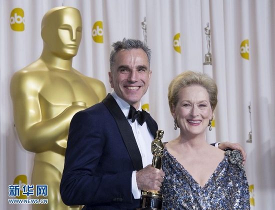 2月24日,在美国好莱坞杜比剧院,获最佳男主角奖的演员丹尼尔·戴-刘易斯(左)和美国著名电影演员梅里尔·斯特里普在后台合影。第85届当天在美国洛杉矶好莱坞杜比剧院举行。