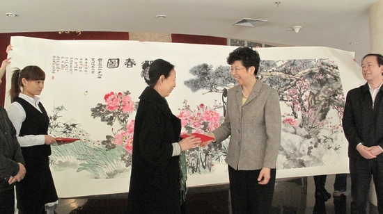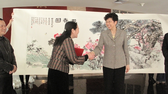 3月8日,中国美协、中国女画家协会向中国文艺家之家捐赠女画家集体创作丈二花鸟《迎春图》。中国文联党组书记、副主席赵实,中国文联党组成员、副主席左中一和刘尚军、张旭光、陶勤以及孔紫、王迎春、朱理存等画家代表出席捐赠仪式。