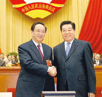 3月11日,全国政协十二届一次会议在北京人民大会堂举行第四次全体会议,俞正声当选政协第十二届全国委员会主席。这是政协第十一届全国委员会主席贾庆林和俞正声亲切握手,表示祝贺。 新华社记者 鞠 鹏摄
