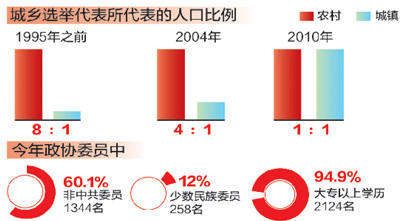 十二届全国人大代表选举首次实行城乡按相同人口比例选举,每67万人分配1名代表名额。而在1995年之前,我国农村与城镇每个人大代表所代表的人口比例为8∶1;此后全国人大常委会修改选举法,城乡选举代表所代表的人口比例调整为4∶1;2010年,选举法修正案明确实行城乡按相同人口比例选举人大代表。