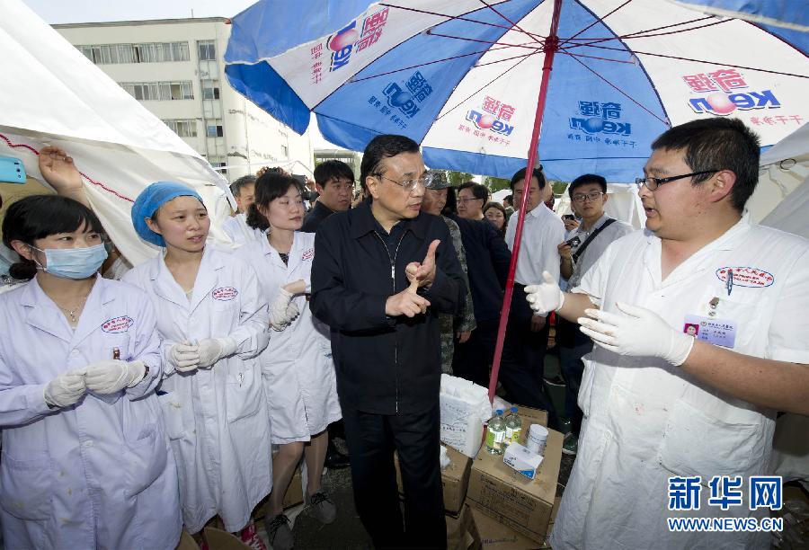 4月20日,中共中央政治局常委、国务院总理李克强抵达四川芦山地震灾区察看灾情,部署抗震救灾工作。这是李克强在芦山县医院向医护人员询问受伤群众救治情况。新华社记者 黄敬文 摄