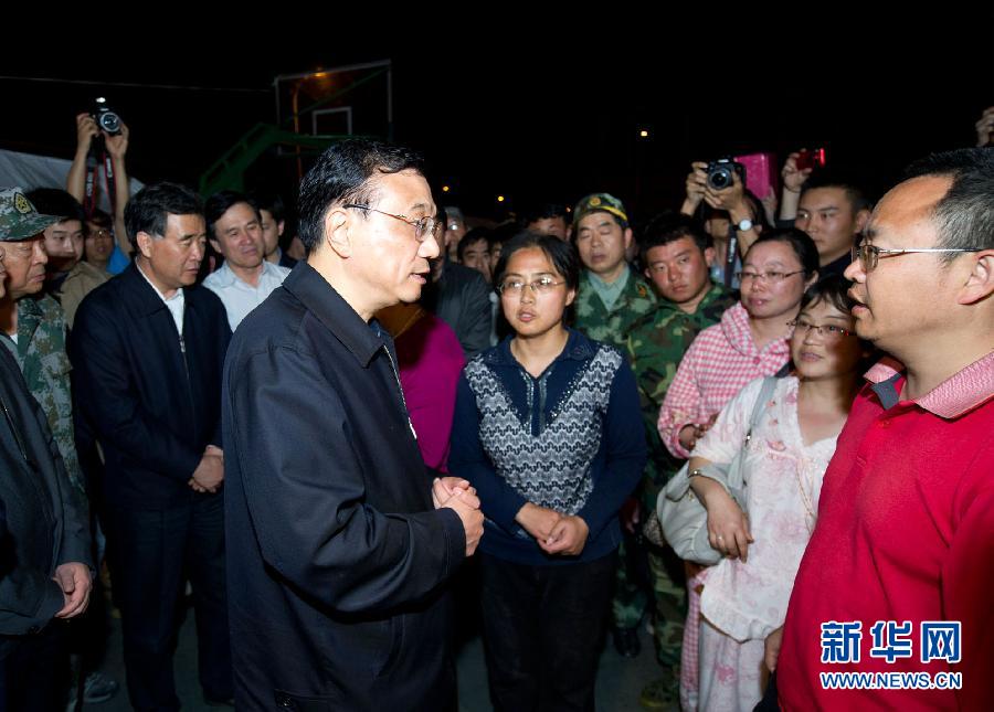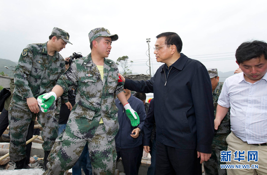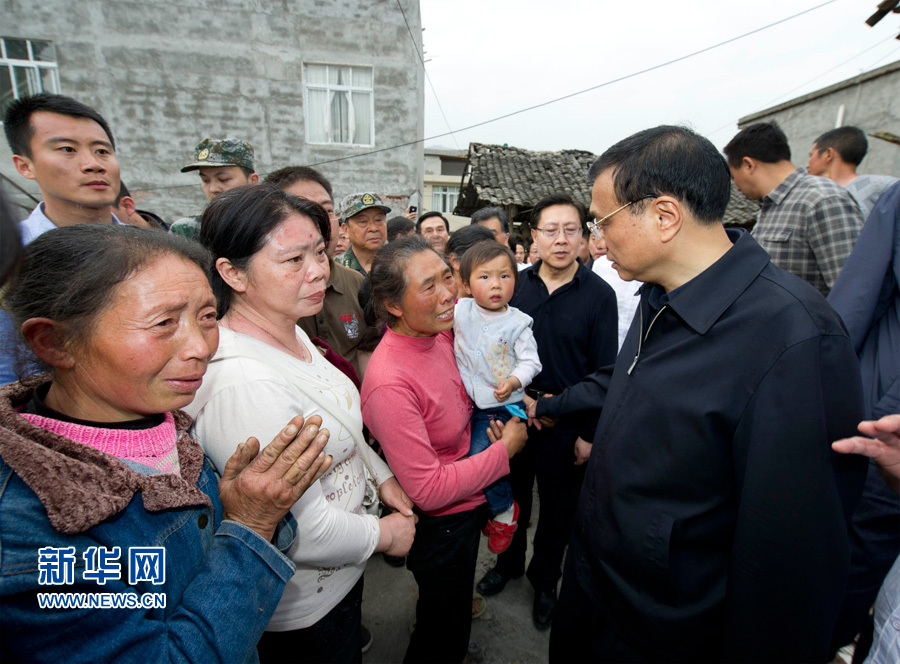 4月20日,中共中央政治局常委、国务院总理李克强抵达四川芦山地震灾区察看灾情,部署抗震救灾工作。这是李克强在灾情严重的双石镇看望受灾群众。新华社记者 黄敬文 摄